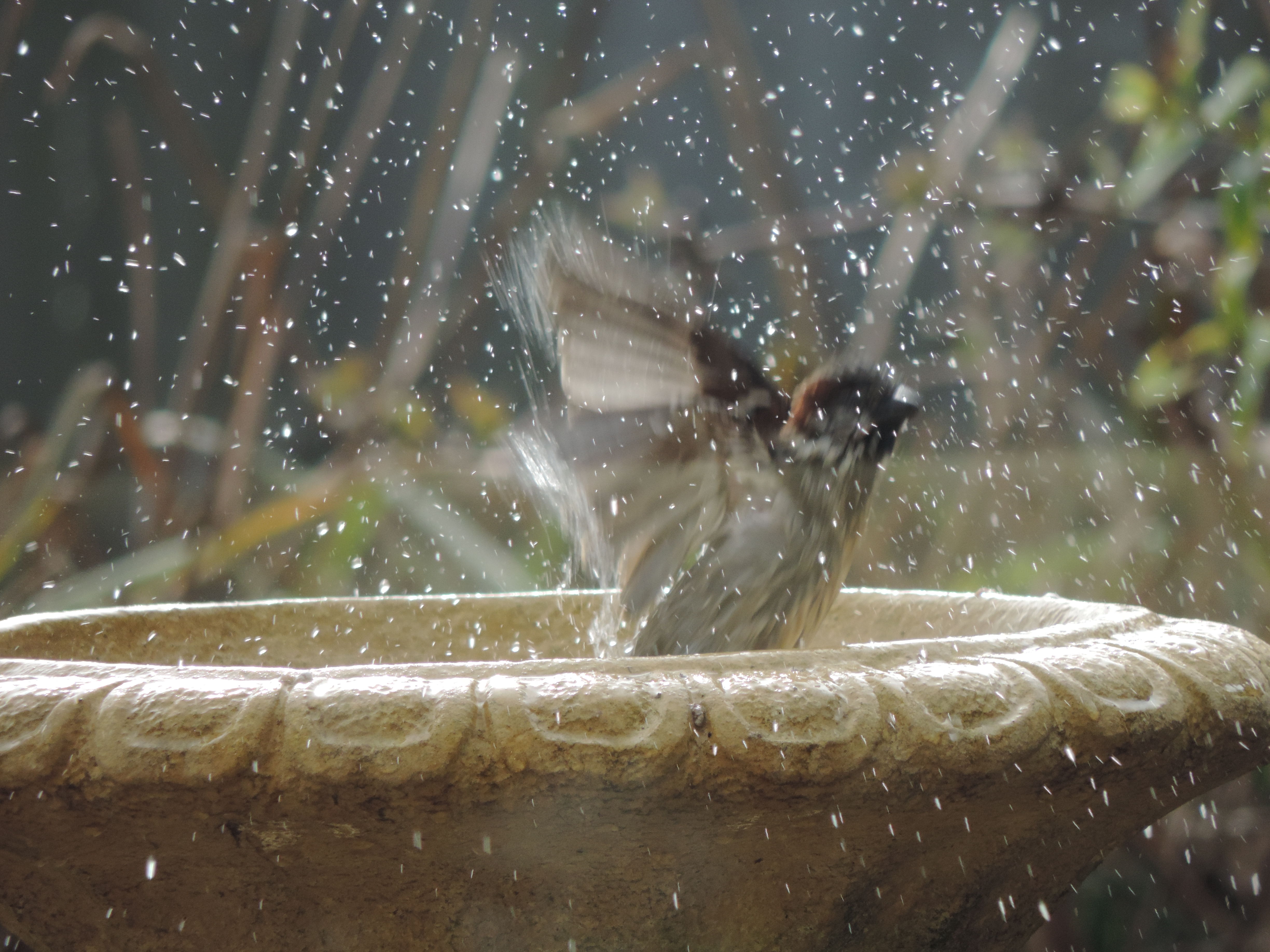 1. There is a great big tree up the road that seems to have a huge family colonised within.The whole tree is filled with bird song most of the time.A lot of ivy is taking over the tree…. hence its great for sparrows! They sometimes take a break in a lesser hedge in our garden then take to the waters here lunch time!. They do very well here!