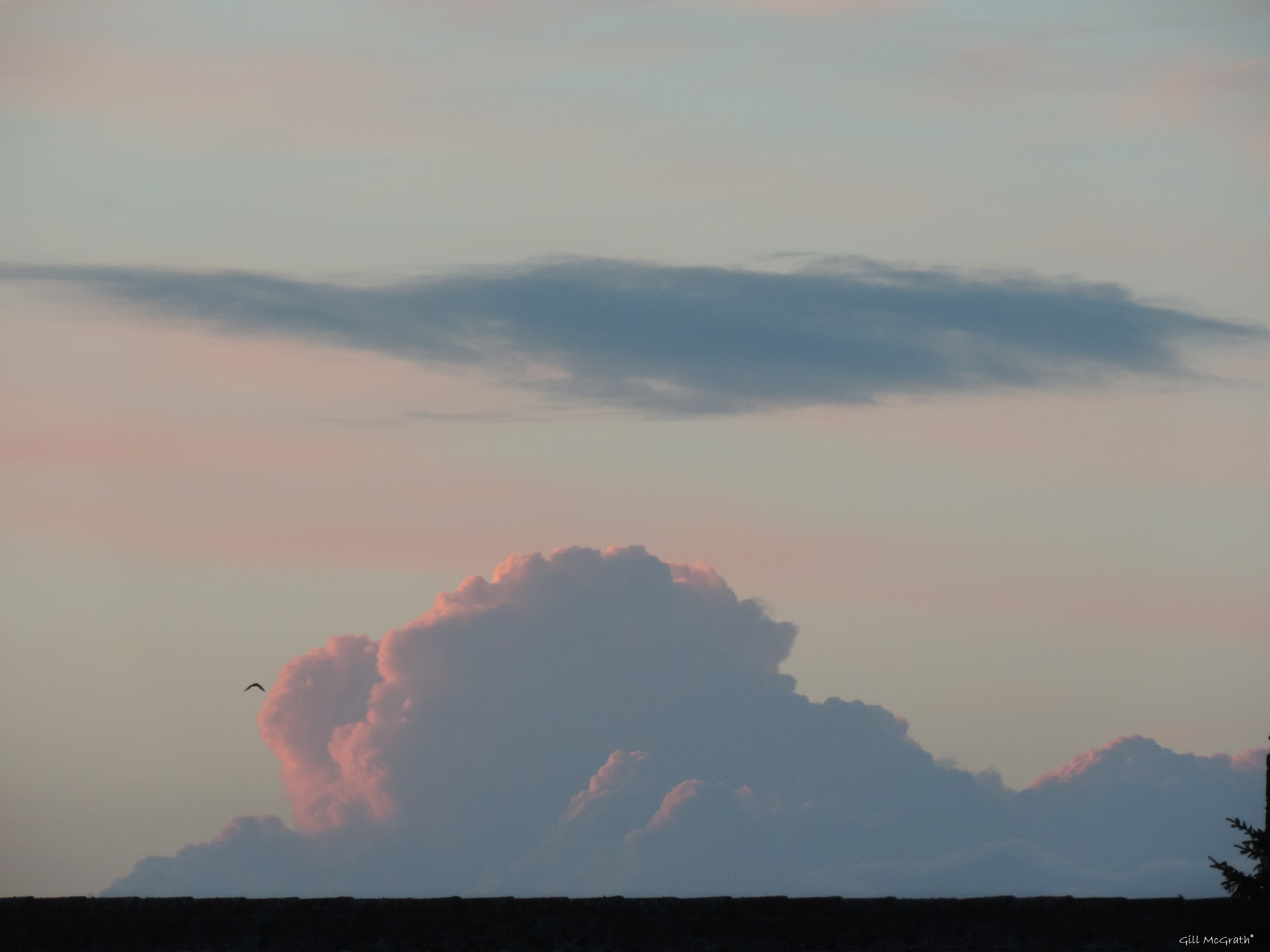Twin Peaks 3 (pink) Diary. Same clouds (as Twin Peaks 1 and 2) altered a bit now pink tinged ! At about 9.50 pm.reflecting the sun setting….. as seen from landing window GM Share this: Click to share on X (Opens in new window) X Click to share on Facebook (Opens in new window) Facebook More Click to email a link to a friend (Opens in new window) Email Like Loading... Related