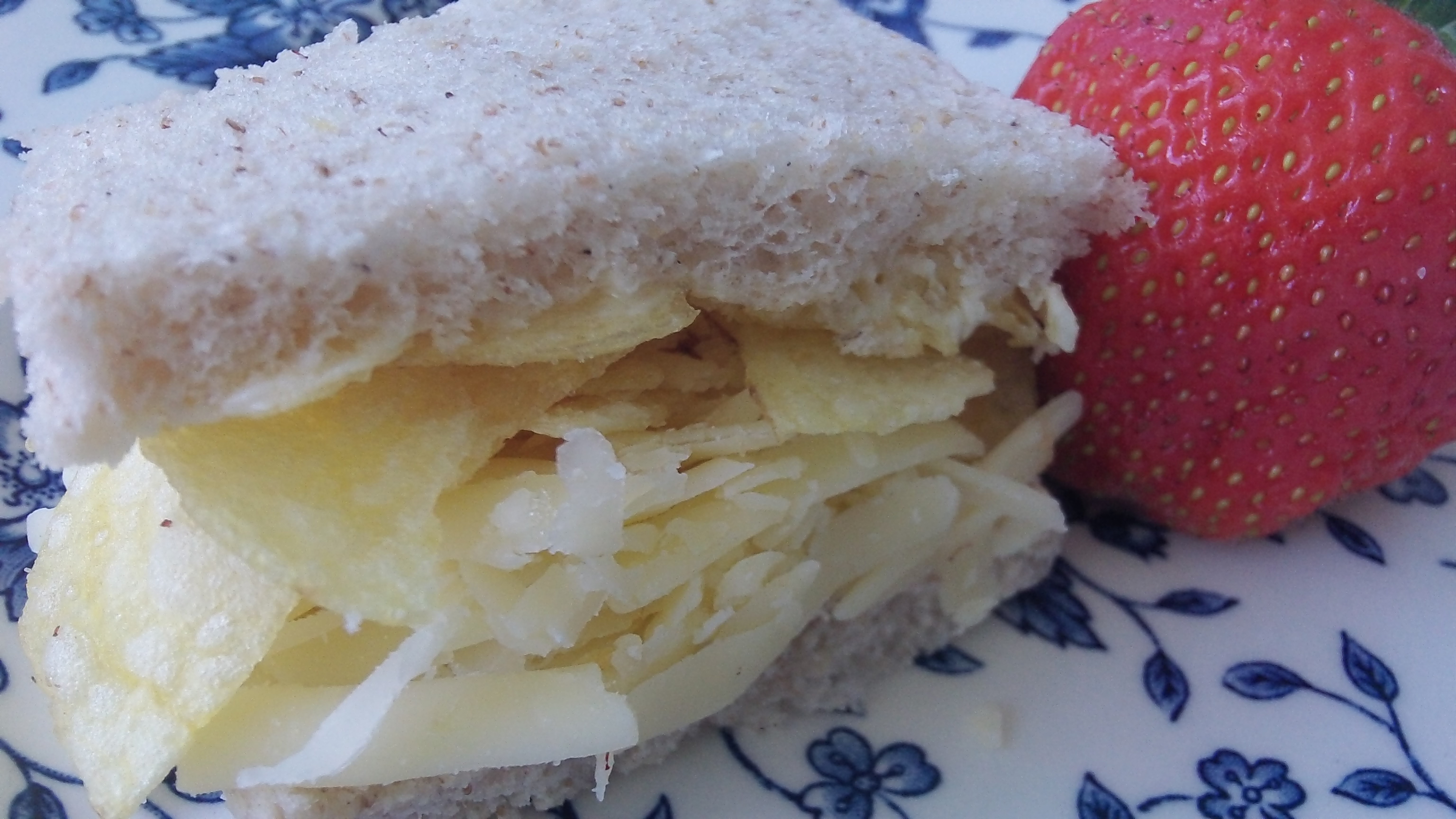 Put a very thick layer of grated cheddar cheese on one of the pieces of thickly buttered bread, followed by a thick layer of rough crushed crisps and cover with the other piece of thickly buttered bread and cut into dainty squares. Serve.
