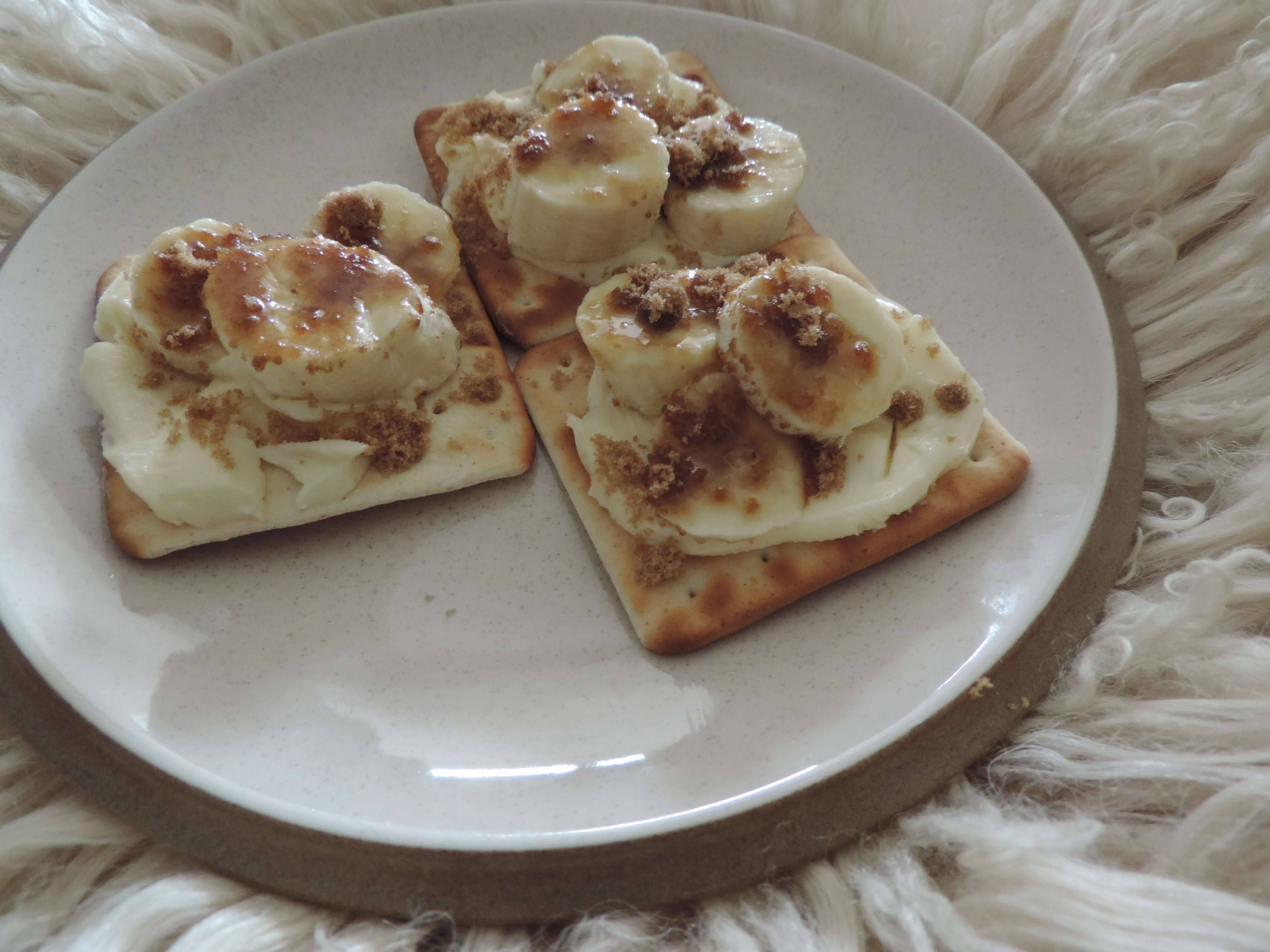 One heaped teaspoon of Dark Muscovado Sugar on three slices of banana on thick butter on one cracker.