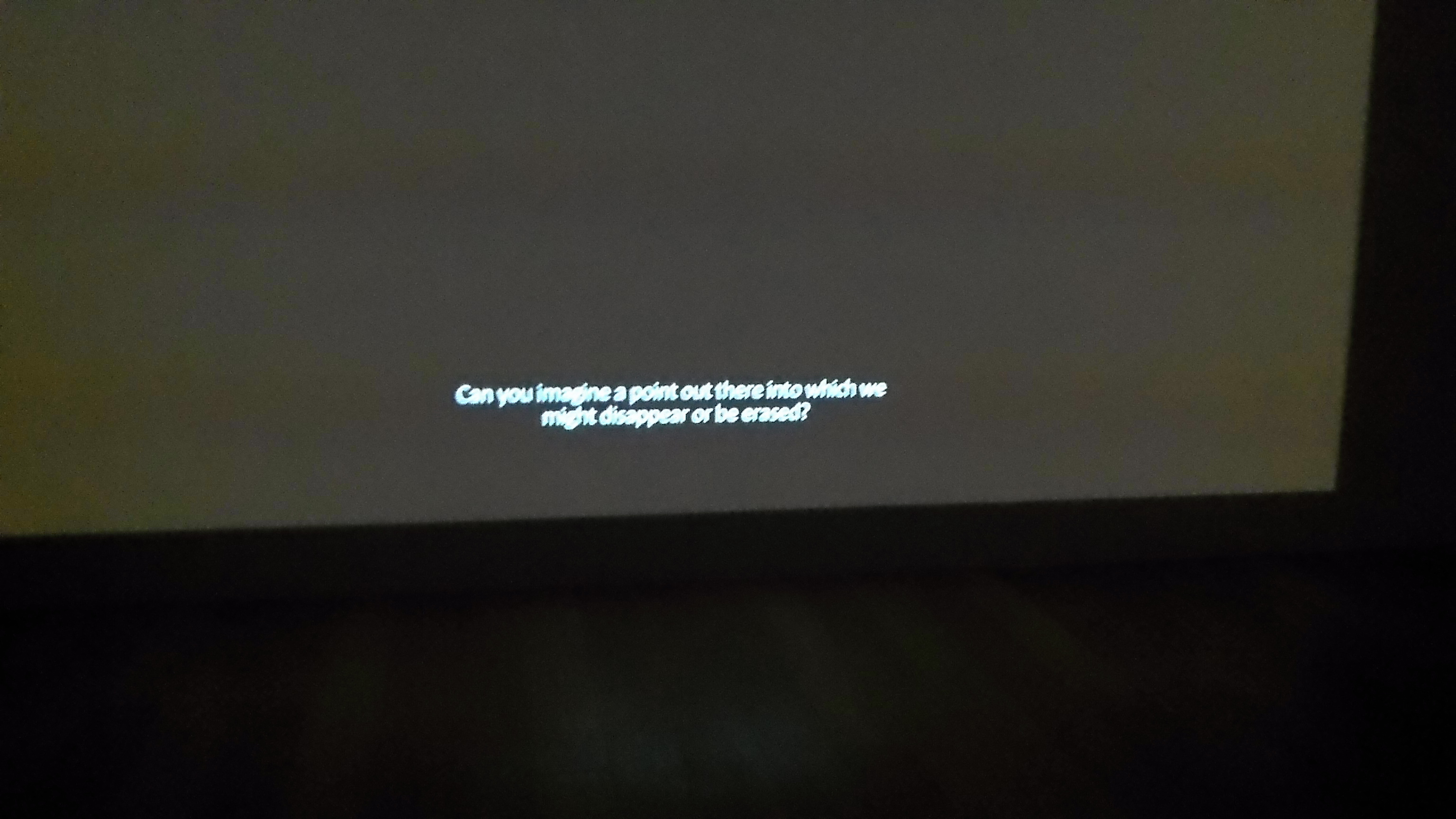 ‘Can you imagine a point out there into which we might disappear or be erased?’ asks the voice gently, now with a blank screen, only subtitles in focus.