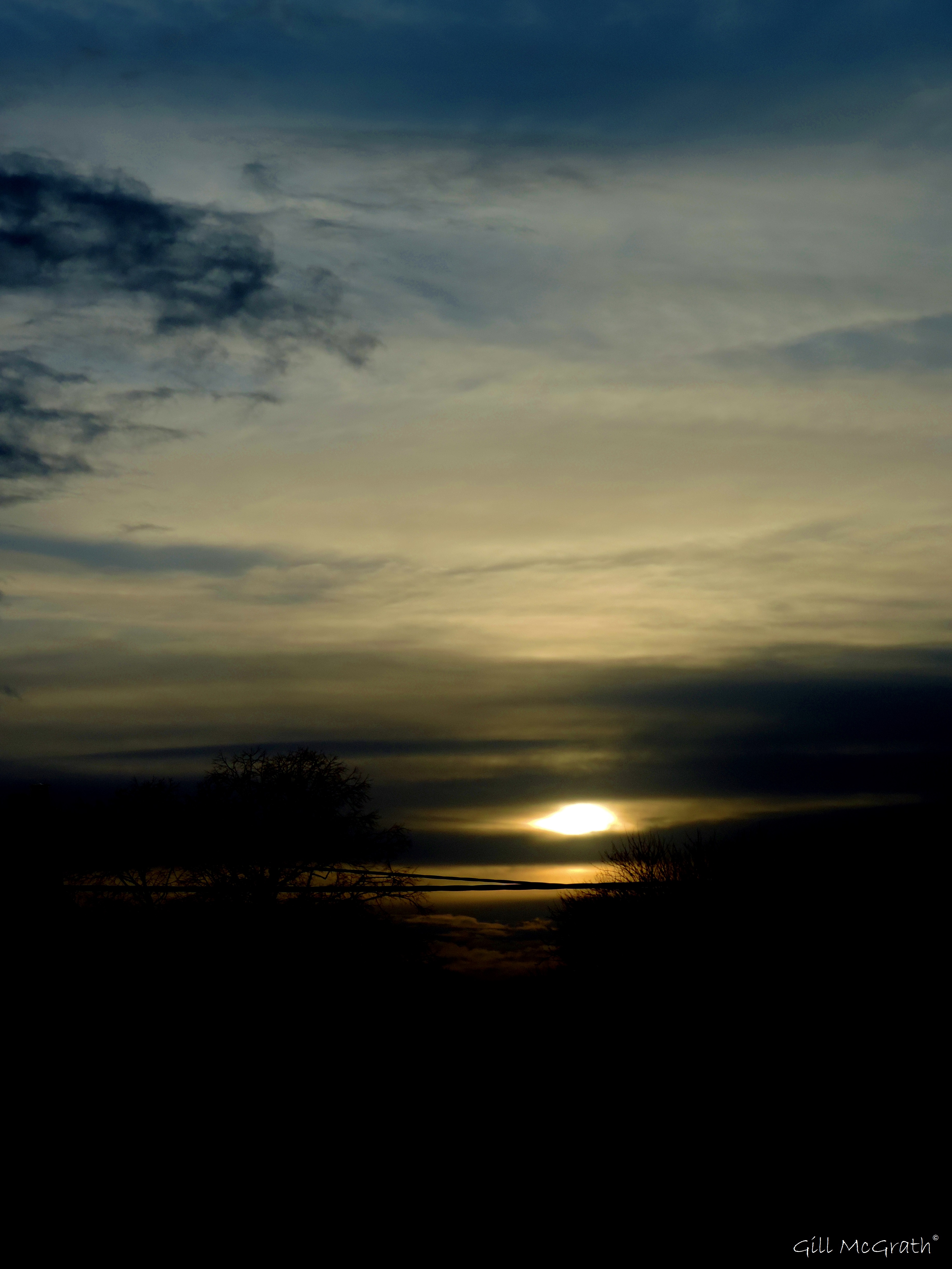 Up too late to catch the first pink of dawn over the way, I went into garden barefoot,with the camera- what a mistake – the grass was so cold, so wet, I nearly flew back to the kitchen. But the pigeon pair, sitting on one of the lines above under the blue were in the middle of a conversation clearly excited about the hazy golden sun getting ever brighter and still rising in the middle of the gap over the way.