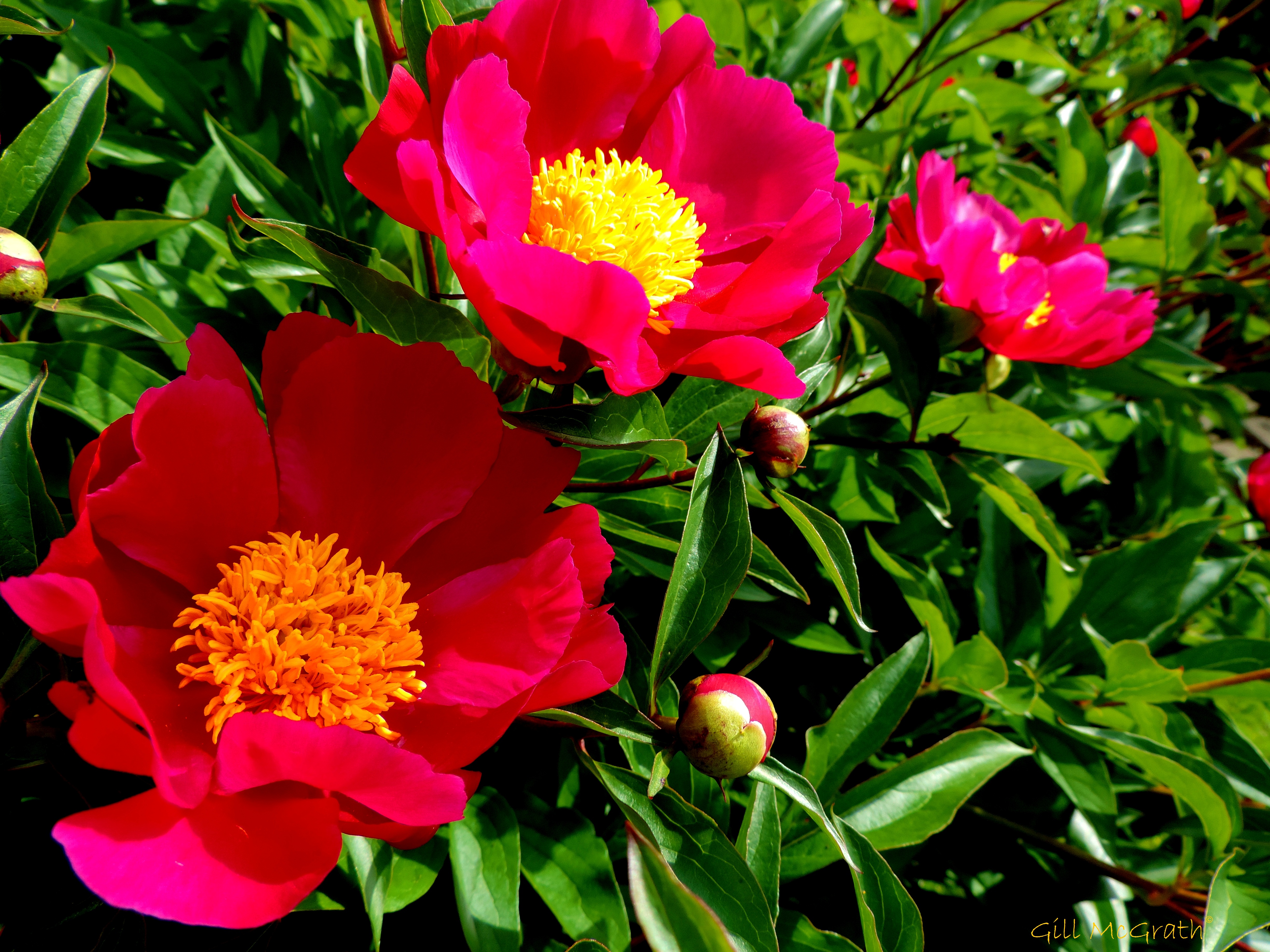 The latest round of peonies are blooming (early) in the border! These are singles, and are very light headed so they can hold up their heads with out the droop!……but, they are still a quirky act as they only open up in full sun. That is they have to look directly at the sun in order to open at all! The garden enjoys full sun all day but as I write at 6 pm and with the sun on a slant heading west they have already wrapped up for the day! Press the picture for a close look (while you can) and see the gold they hide!Even the bees are getting angry because the yellow is now unavailable! It was very sunny, earlier when I caught these little beauties by surprise!