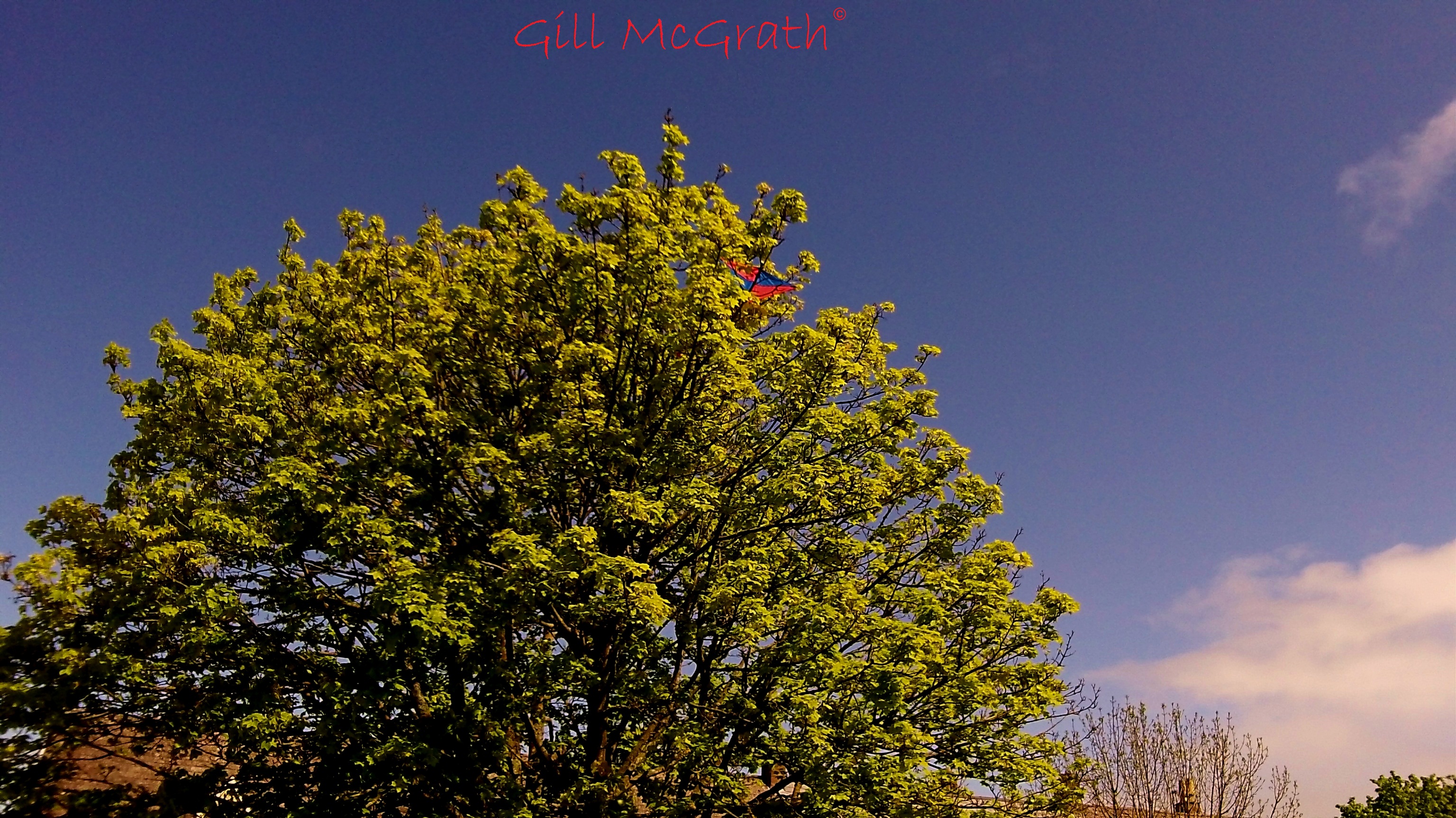 The kite has been stuck up there since the end of last summer and has been there for all to see in the bare branches all winter. No one can get it down, although we did try. It has seen every sunrise from there ever since. So weighing the restraints of being stuck up there against sitting in a prize place; where it can play up there with the moon and the stars and even count cars; the kite can’t be that unhappy! So there it stays. We photograph it from time to time and hang it up on a white wall and compare leaves (or no leaves at all) and admire the blue against blue and change the colours generally. It has become a project; a piece of art outside the bathroom! Or, the kite can be seen from afar as a delightful sign post out on the road which shows everyone where we live near a pole. It still wishes it could fly though…..
