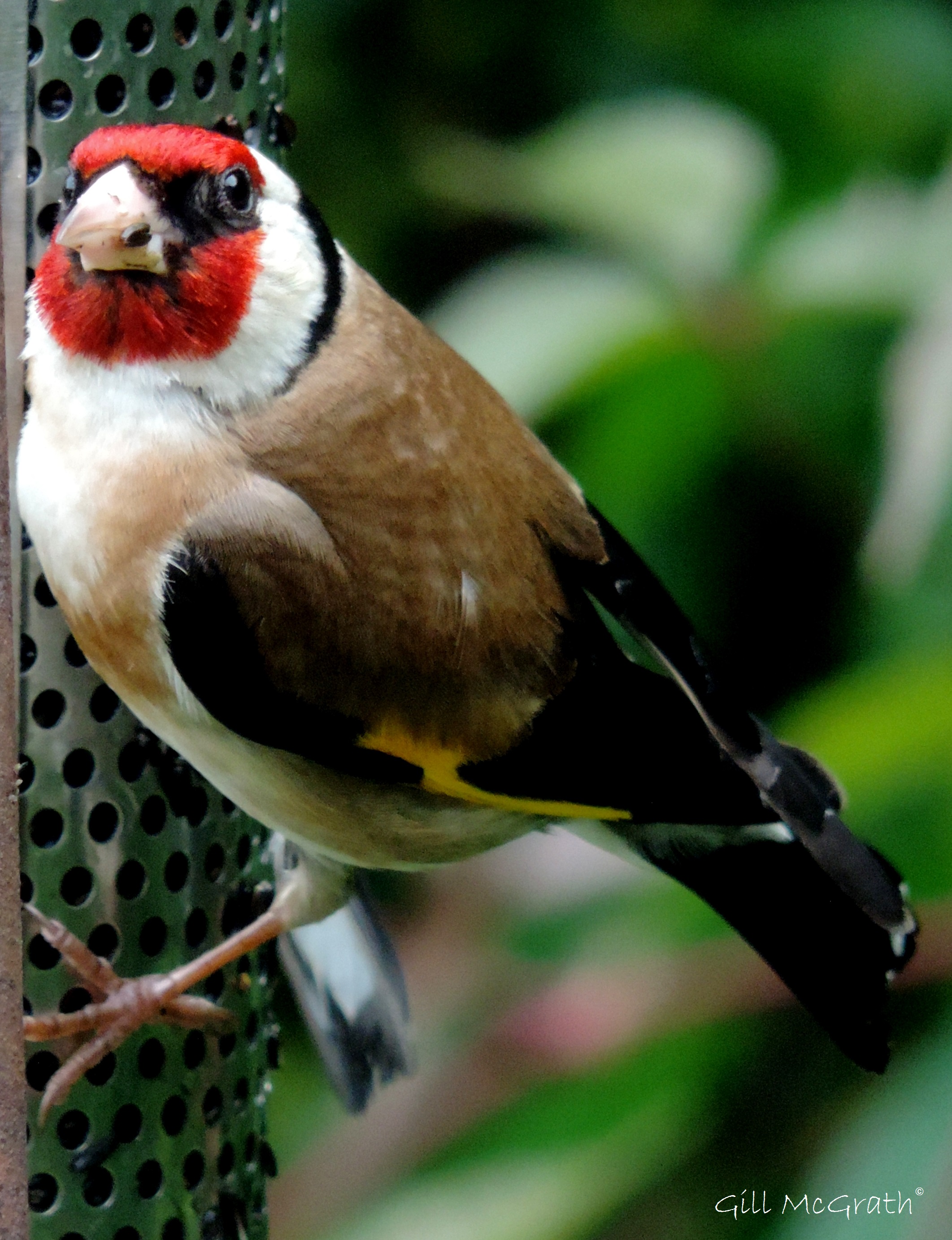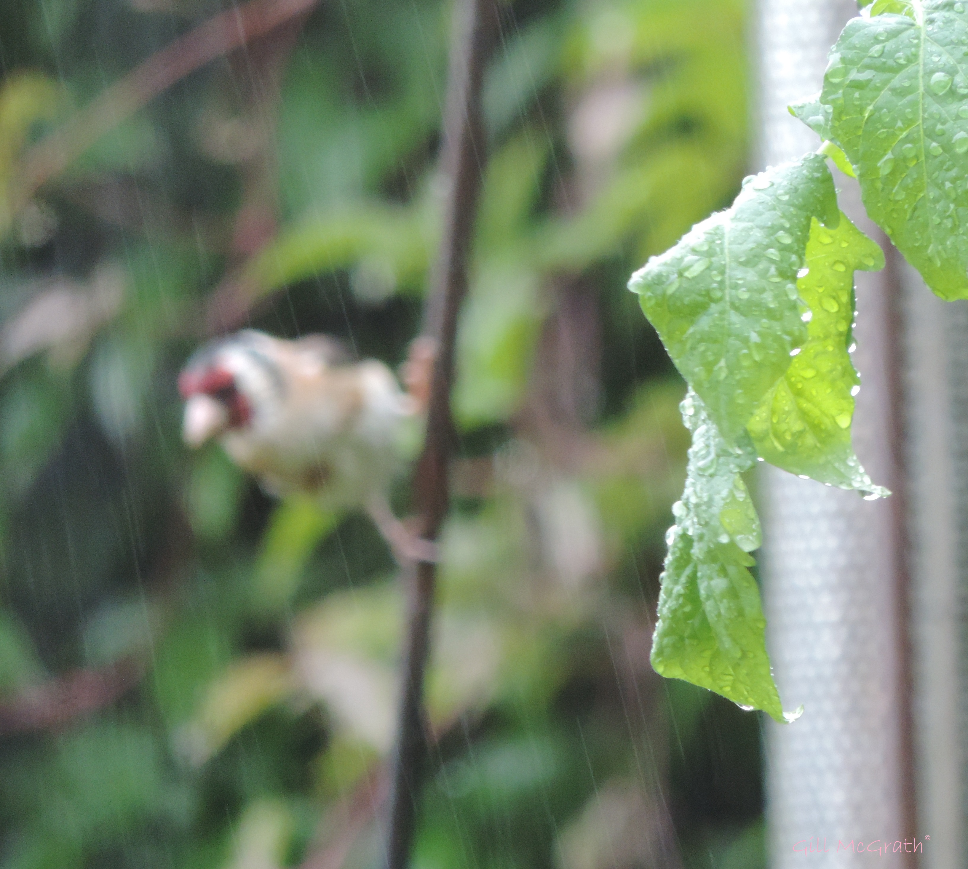The feeder has been out there for a month stuffed with thistle seed to attract the finches but there has not been a sign of interest from any bird ~ until yesterday. A goldfinch, in the middle of cold rain ! and today in a tiny piece of sun he brought a friend along….
