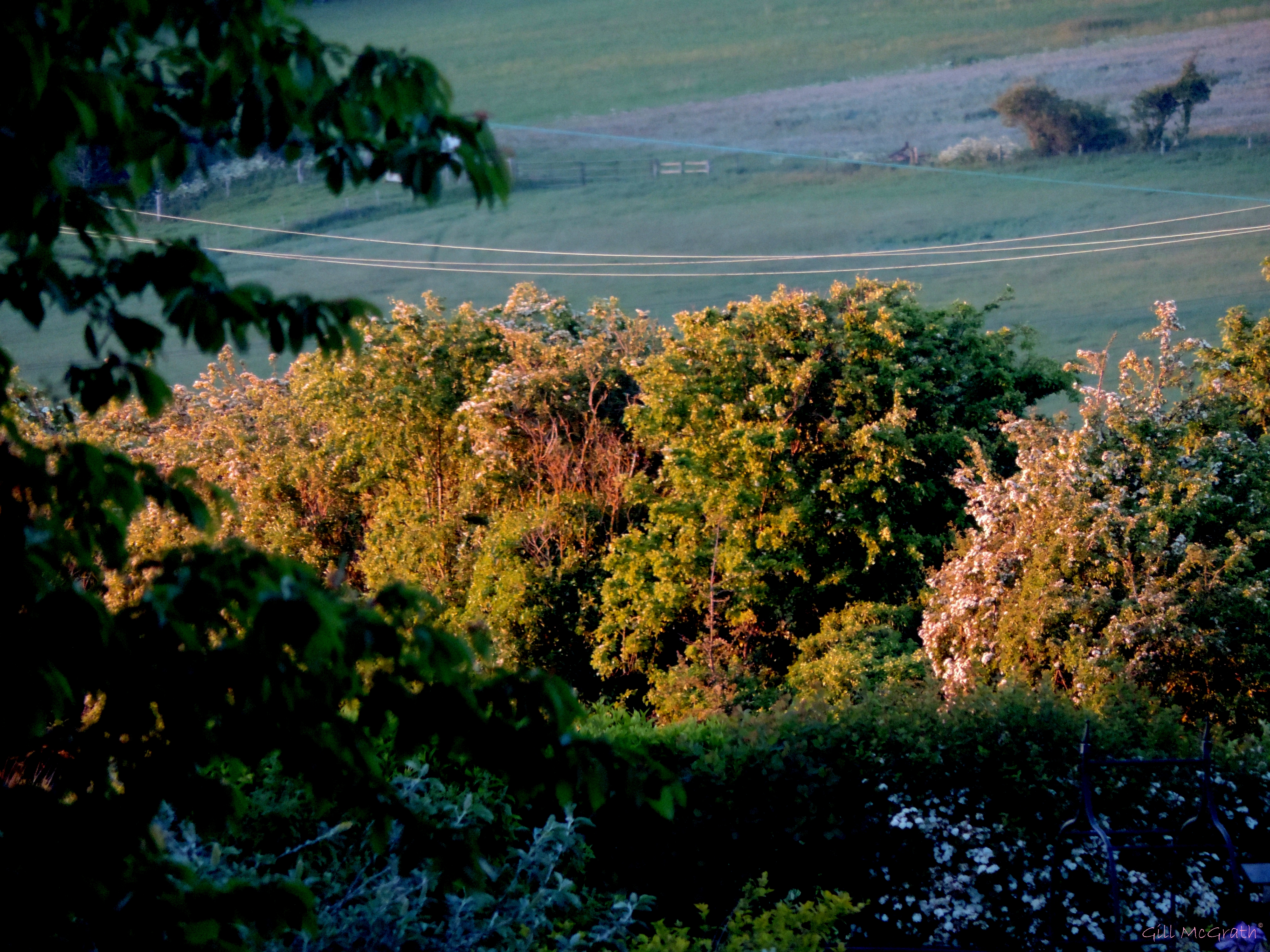 Under a bright blue sky at about 9.30 am this morning I nosed round the garden to see if there was anything new and found the first rose in the hedge where two birds are busy flying in and out feeding their noisy babies – then one deep pink little flower pushing through from next door, quite close to the rose!