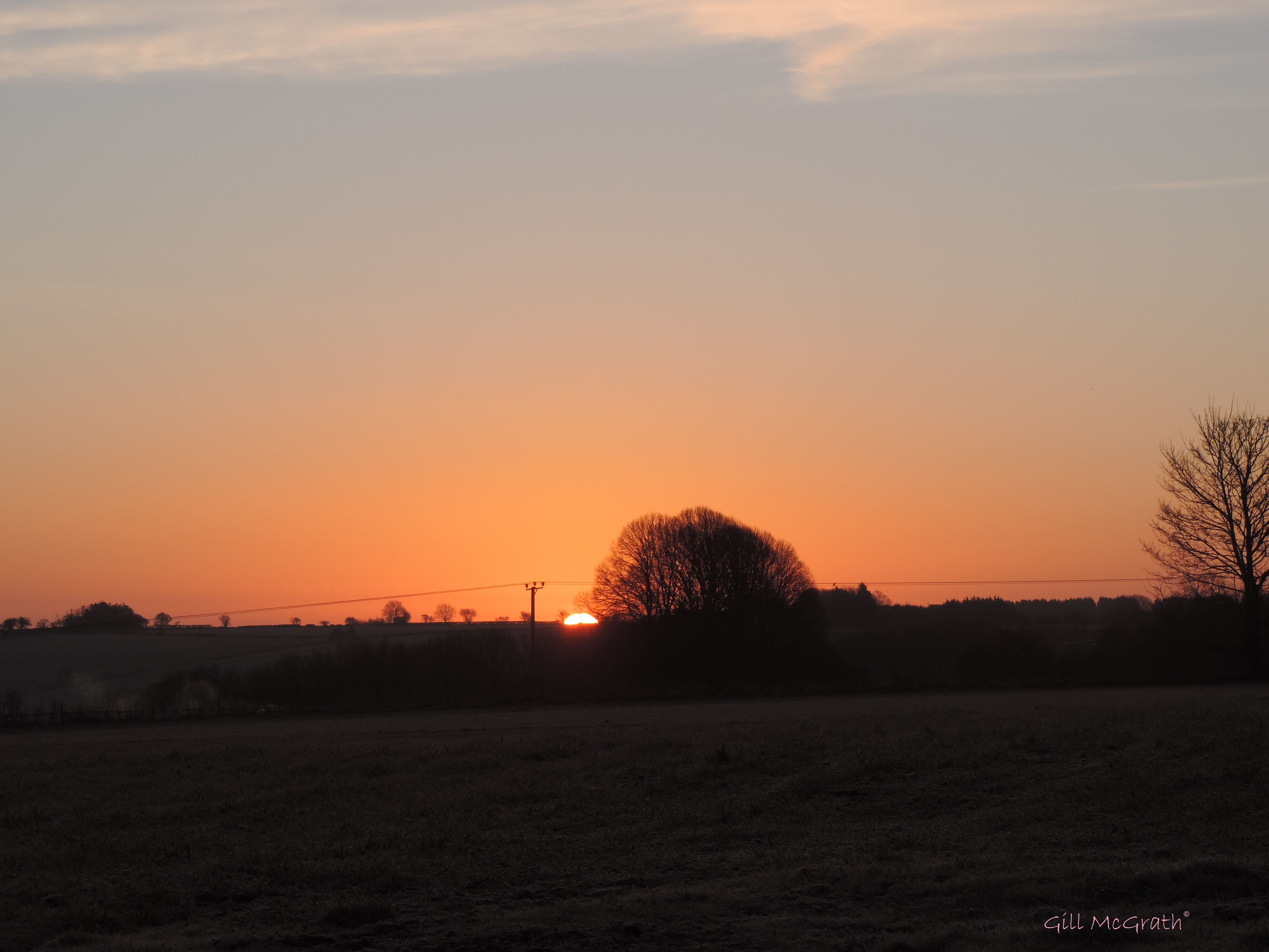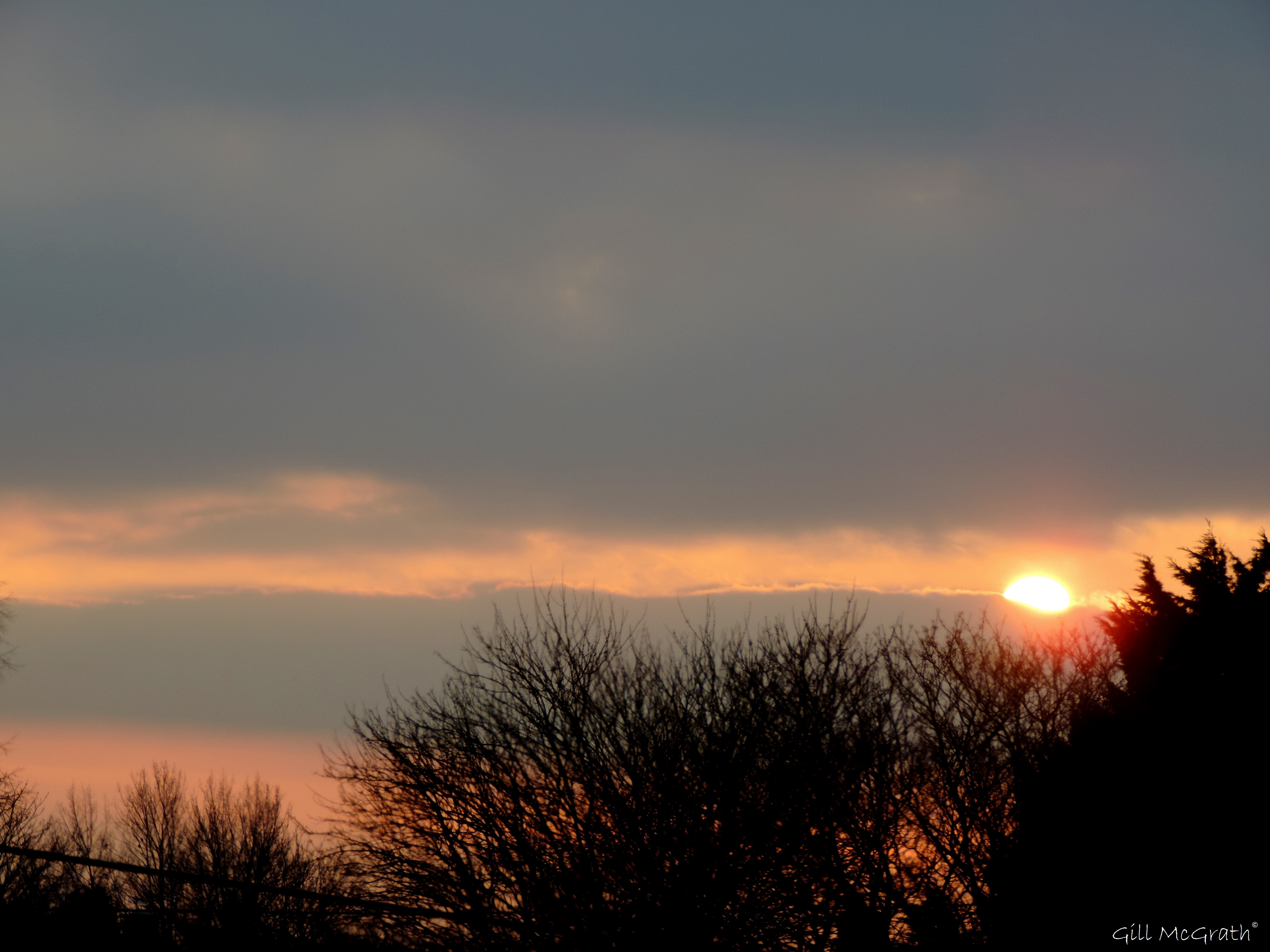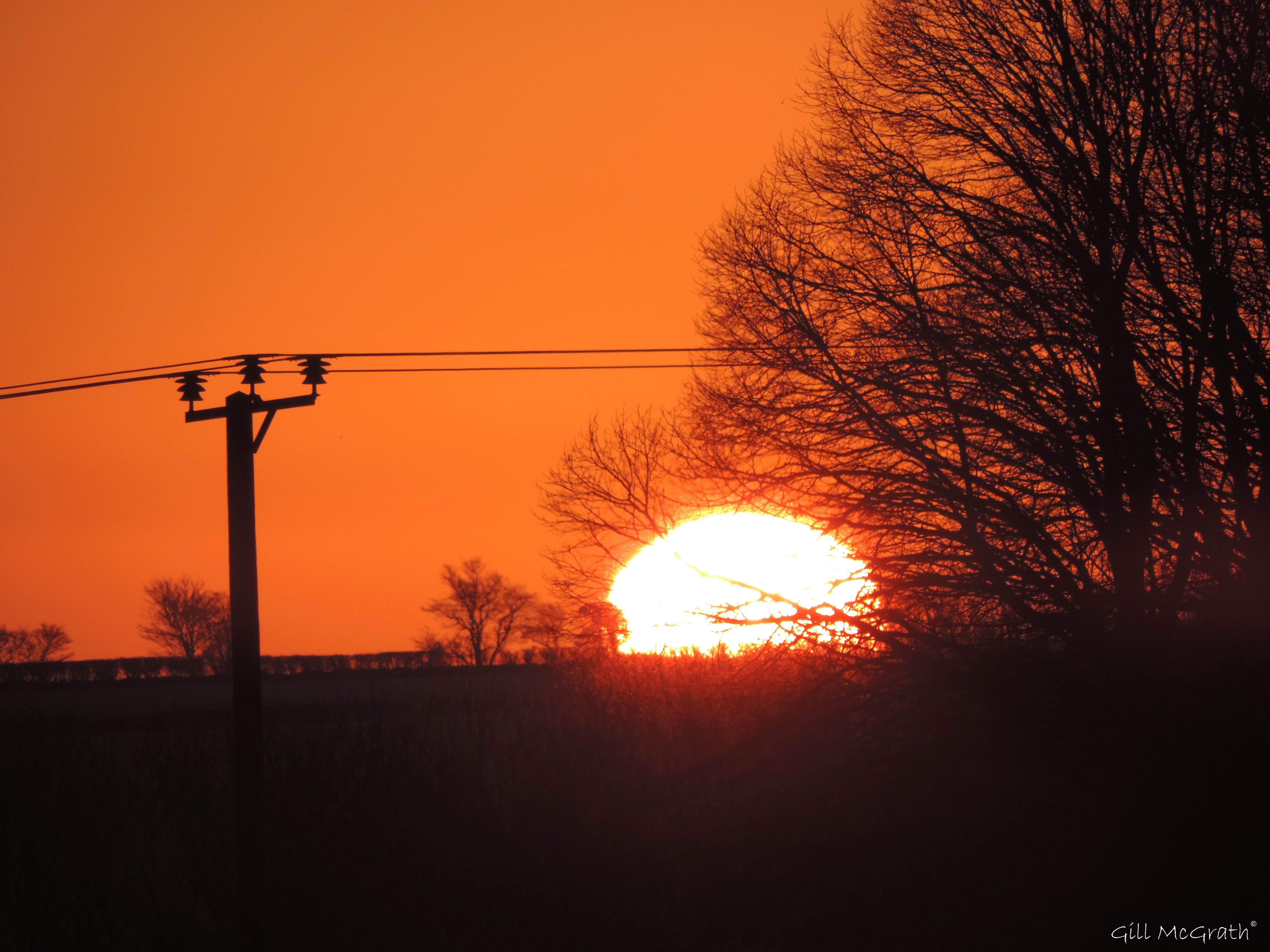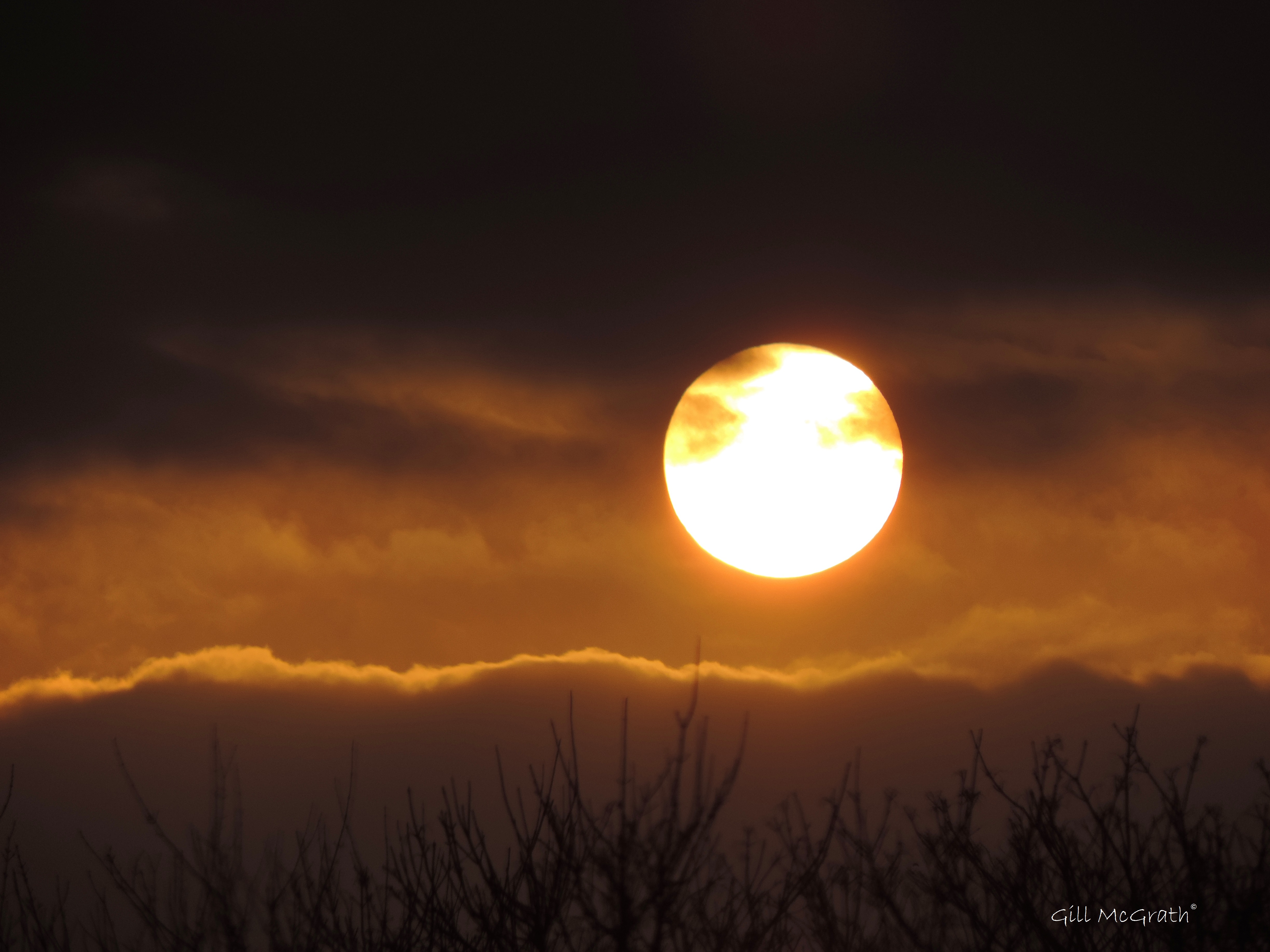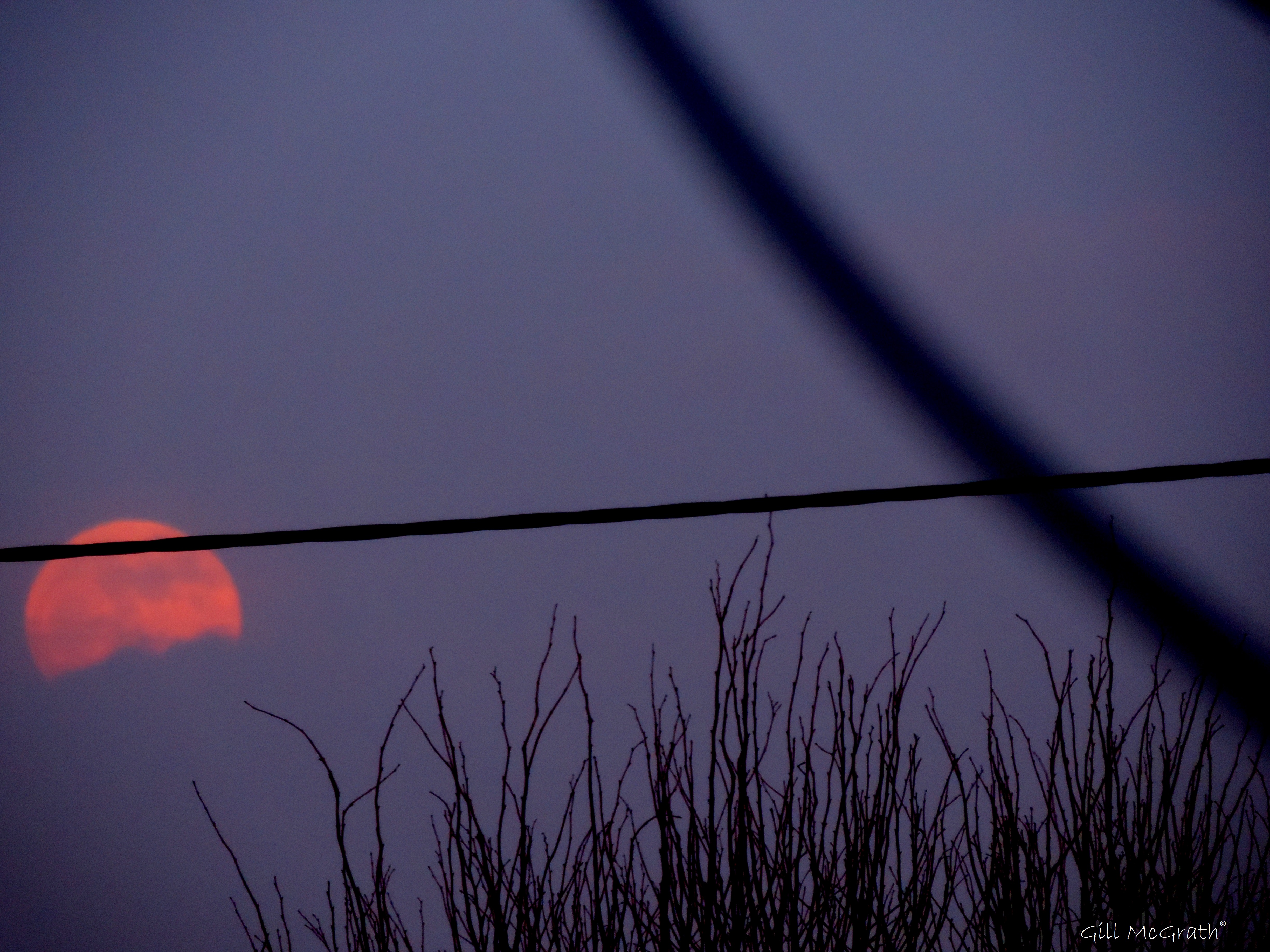 sundown…… then the moon the last piece of the sun tonight….. gone. 4.50 pm surprise! through a window. over a tree. a red moon peeking over a cloud. 5.14 pm then over the fields. same moon….. 5.15 pm Gill McGrath © Share this: Click to share on X (Opens in new window) X Click to share on Facebook (Opens in new window) Facebook More Click to email a link to a friend (Opens in new window) Email Like Loading... Posted on February 3, 2015 by Gill McGrath 14