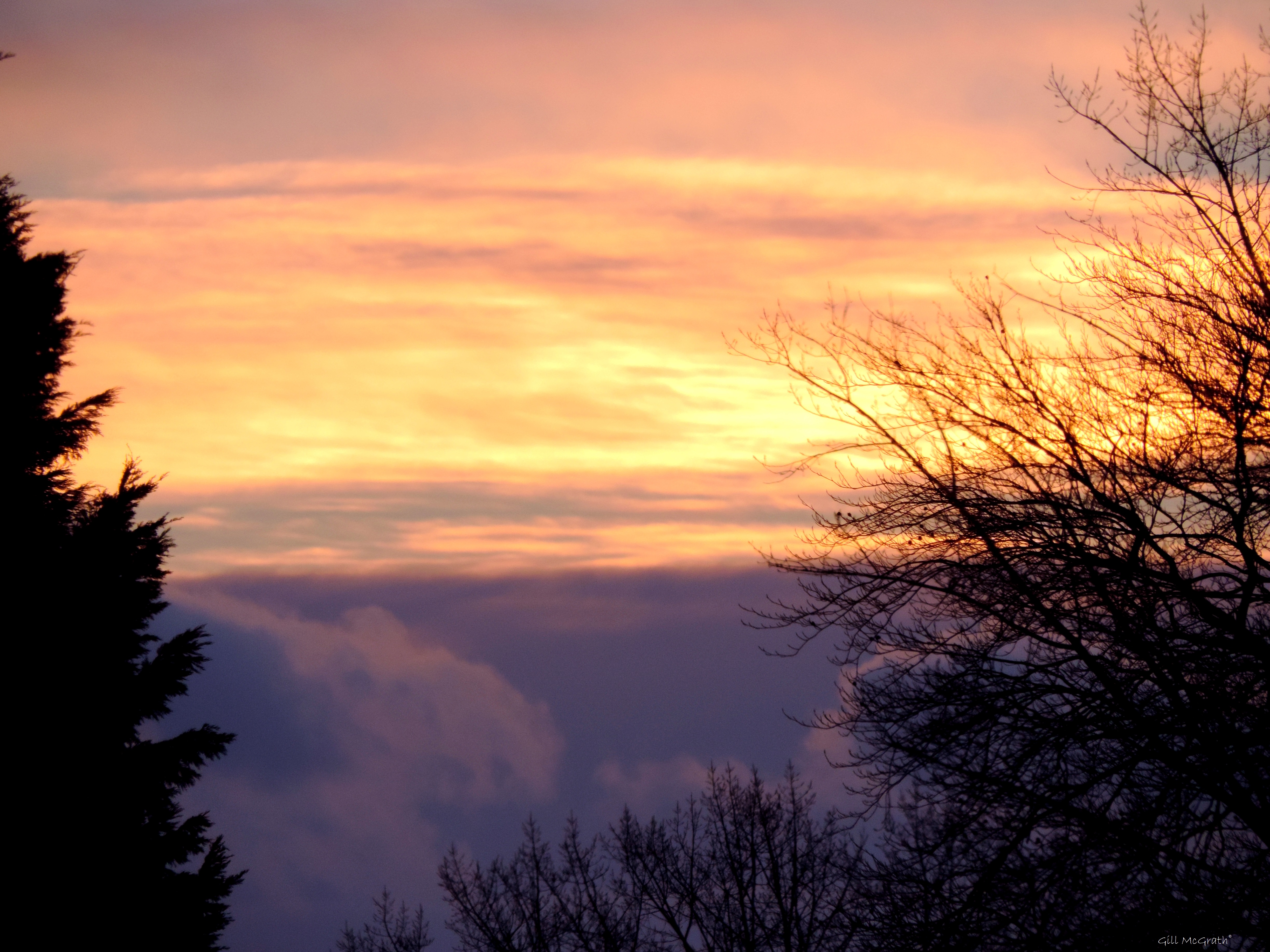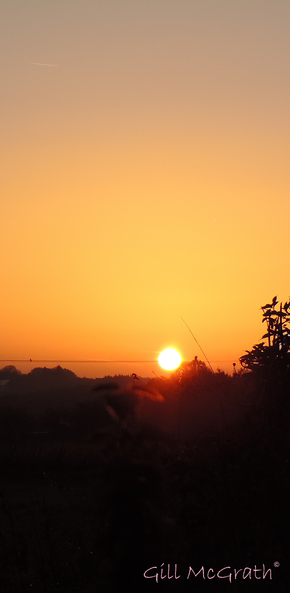 But I know where she is; I know precisely where she is singing that song, even though there is a permanent thick miserable cloud glued to the horizon which she must be always trying to climb up and over….. hardly stopping early afternoon before the daily roller coaster ride downhill, into some thinner cloud right opposite my house, where I might catch her. It might only be for a short glimpse of her and sometimes it is the first glimpse of the sun for the first time all day, but it is here the sun finds she can wave for a dramatic colourful few minutes and say goodnight…. after a day that hardly lit up!
