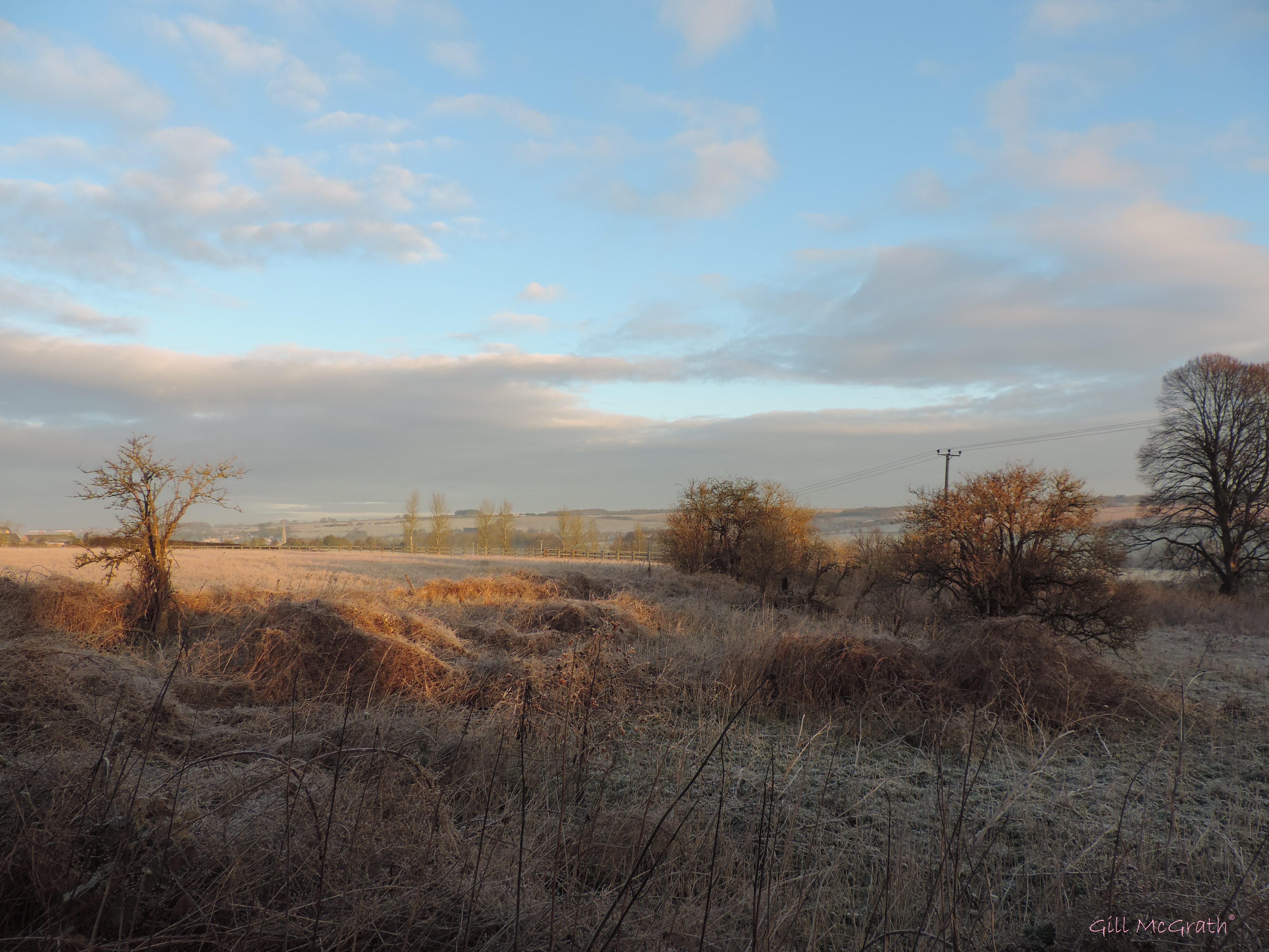 I simply didn’t realize when I took this photo four weeks ago that this might be the last glimpse of the waking morning sun as I see it from the rabbit field close to the house, the gate, the pole. I have been spoiled. The sun has been moving around me on all sides, all year, in full view over the fields, and the valley along a wide horizon. It has also been playing with the lines which beg me to measure her slow progress. Now the morning sun has finally moved right out of this generous frame and is forced to come out behind a dark wood (to the right) at the top of this sometimes windy sometimes frosty hill…..where I will leave her for a bit.