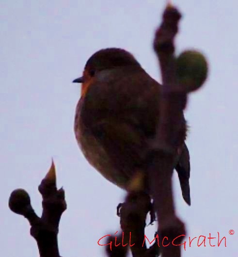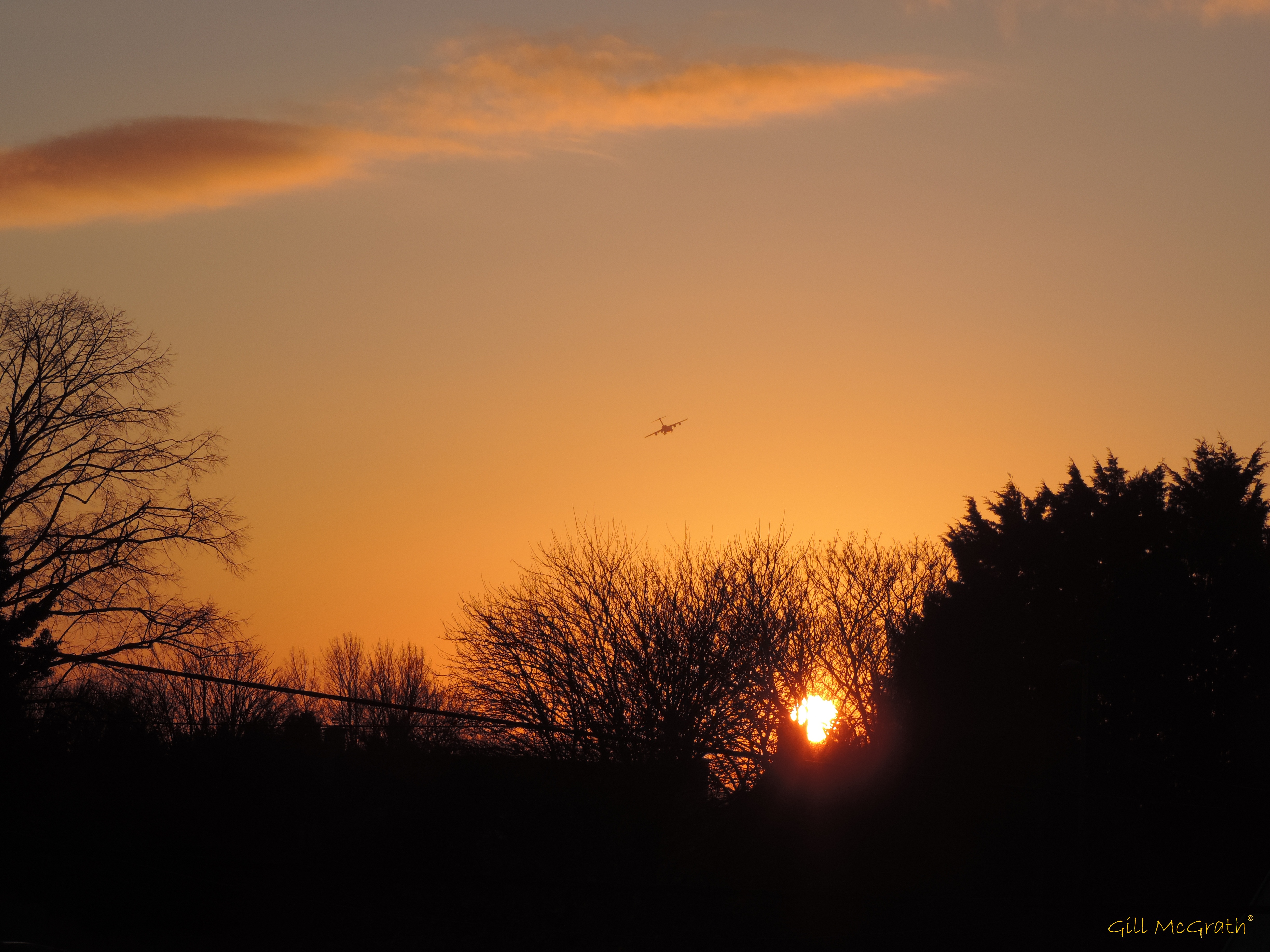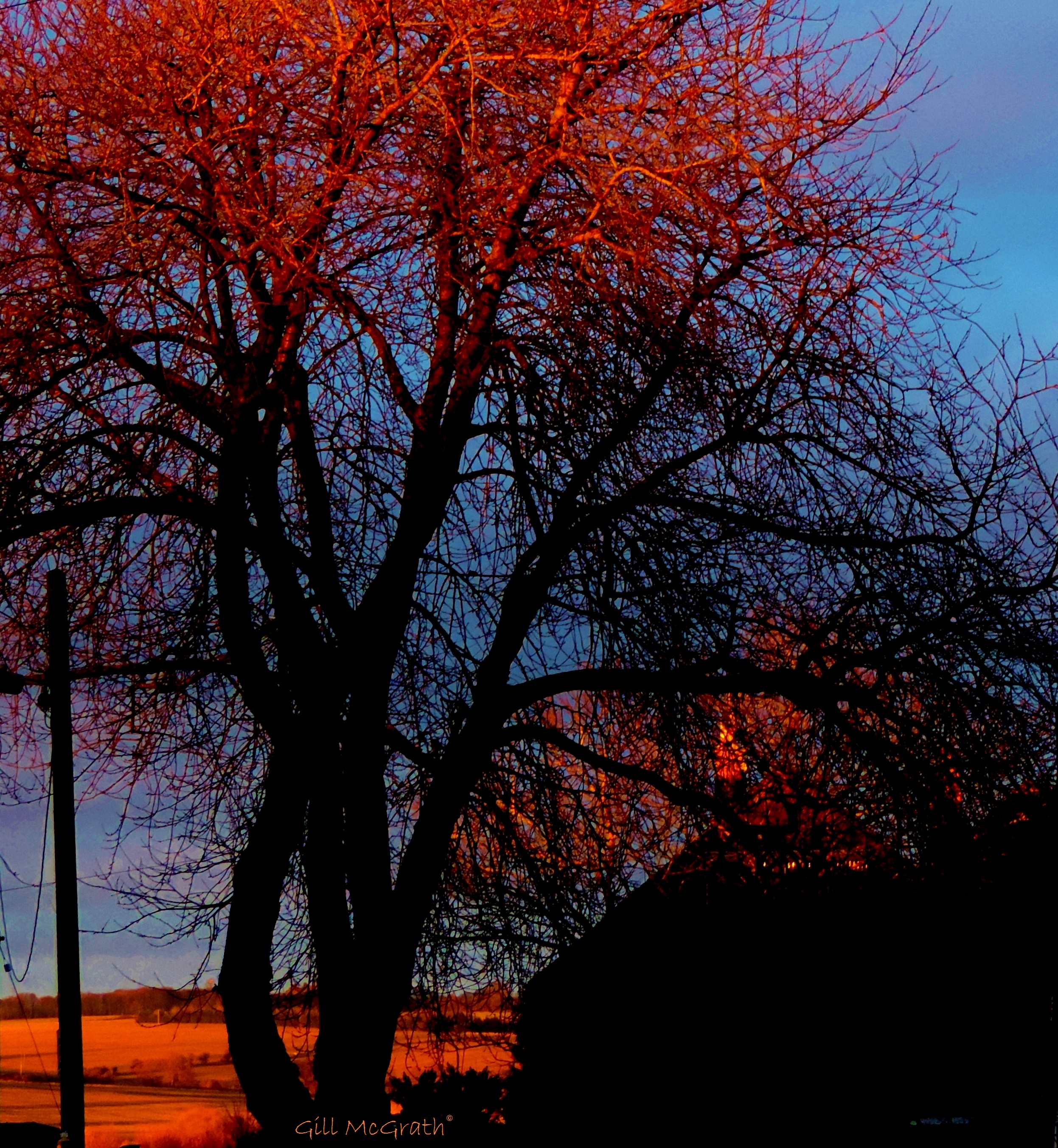 I wasn’t looking for the sun. I wasn’t expecting to see it at all because of the thick grey cloud which had been clinging tightly to the spot where it usually arrives on time; the bit I keep my eye on. A strange brown light suddenly filled the room. Outside the air looked orange. Grabbing the camera I ran up stairs to find the sun. No sun; I had missed it, but its red trail was disappearing swiftly behind the fir tree across the way and leaving a strong orange glow in the air between here and there. Through the window on the opposite side I could see it throwing a wide ribbon of bright orange light all over the fields at the end of the road; lancing the roof tops, lighting up the windows, dancing through the tops of trees, sprinkling its dust on anything in its wake; orange, bright as fire glow; for two minutes. This is the best I could do before it suddenly ran out of breath, switched off…….